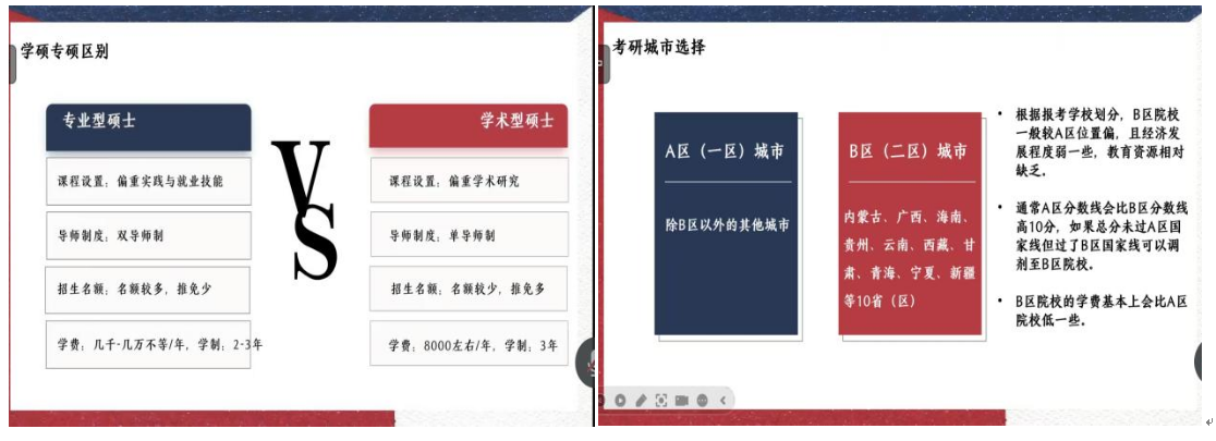 郭艳红学姐首先深入浅出地阐述了学硕与专硕之间的核心差异,结合自己的考研实战经验,为学弟学妹们精心传授了一系列实用的考试技巧。她不仅详细剖析了各类题型的应对策略,还分享了如何高效复习、管理时间的心得体会,让大家受益匪浅。随后,郭艳红学姐从考研院校选择与城市选择两个维度,为在场的同学们提供了极具价值的参考建议。她结合自己的亲身经历,深入剖析了不同院校的特色与优势,以及不同城市对于个人发展的潜在影响,使大家对于未来的选择有了更加清晰的认识。在分享的最后,郭艳红学姐还强调了劳逸结合的重要性,鼓励大家在学习之余也要注重身心健康的维护。她特别提醒大家,不要盲目攀比学习进度,而是要根据自己的实际情况,合理规划学习时间和节奏,确保在考研之路上能够稳步前行。
