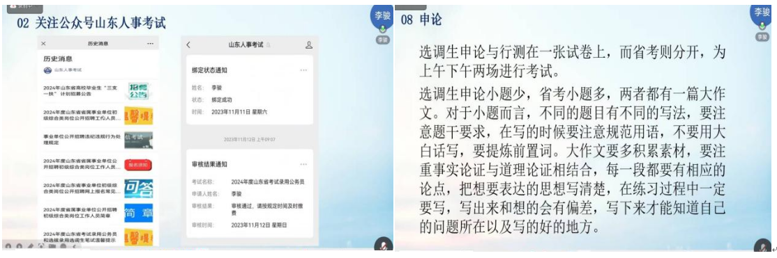 李骏学长以他丰富的经验和独到的见解,从岗位选择、报考网站操作、题型深入解析到备考资源推荐,这四个关键方面进行分享。他讲解得深入浅出,每一个细节都考虑得周到详尽,使得线上每一位同学都能深受启发。接着,李骏学长结合自己的备考经历,分享了许多宝贵的心得。他坦诚地分享了自己在备考过程中的挑战与收获,让我们感受到了他坚韧不拔的精神和勇往直前的决心。同时,他还对历年山东选调和省考情况进行了深入的分析,让我们对考公形势有了更为清晰的认识。最后,李骏学长鼓励大家在备考时一定要沉得住气,保持冷静和耐心。