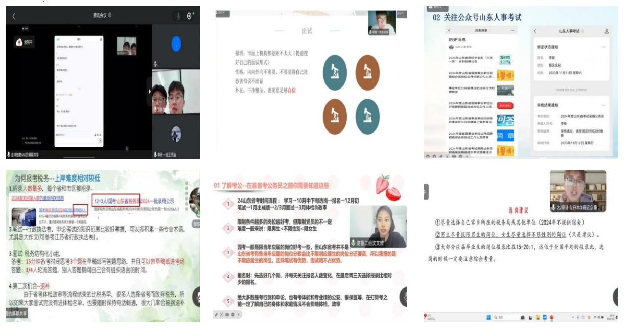 在五场聚焦公务员考试的经验分享会上,冯建发和黄世昌凭借个人经验,不仅一一解答了大家关于考公的诸多疑惑,更为有志于踏入公务员行列的同学提供了全面且实用的考试方式和备考策略;薛雅文和冷飞则结合自身的考公经历,深入剖析了岗位选择的关键性,为备考的同学指明了未来规划的清晰方向;随后,朱志伟和李骏针对山东选调与省考的具体情况,为同学们提供了详尽的分析和见解,大大增强了备考的针对性、科学性和效率;邹乐滢和周孝香则进一步分享了考公大纲的精髓,并推荐了一系列相关课程,同时细致解读了报考岗位的条件,为同学们的备考之路提供了宝贵的指导;最后,沈文雅和迟宗豪通过分享公考的最新动态和现状,帮助同学们打破了信息壁垒,使他们能够更全面地了解公考形势,从而提前制定更为精准的备考规划。