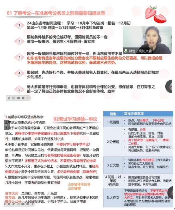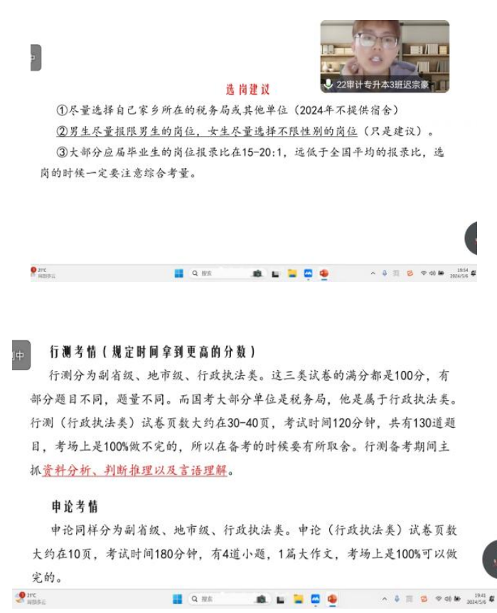 迟宗豪学长则主要对公考现状、具体内容、备考计划和备考建议进行了经验分享。他指出“应届毕业生毕业那年是最容易上岸的”。同时,学长也为备考的同学们提供了推荐的备考计划,为同学们的备考提供有益借鉴。最后,他对公考各类题型的备考学习提供了指导性的方法及课程的推荐。