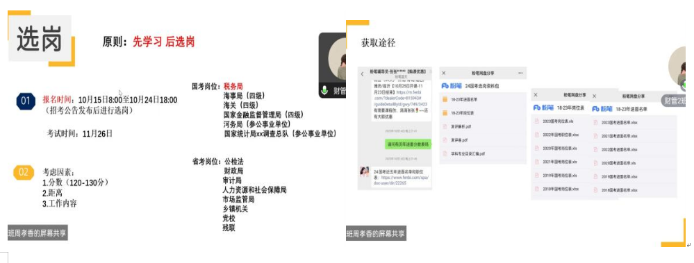 周孝香学姐则主要对选岗进行了经验分享。她指出“先学习,后选岗”,对于选岗大致有三要素,即分数、距离和工作内容。学姐对报考岗位条件做了细致的讲解,并对2023年进面名单进行了分析。