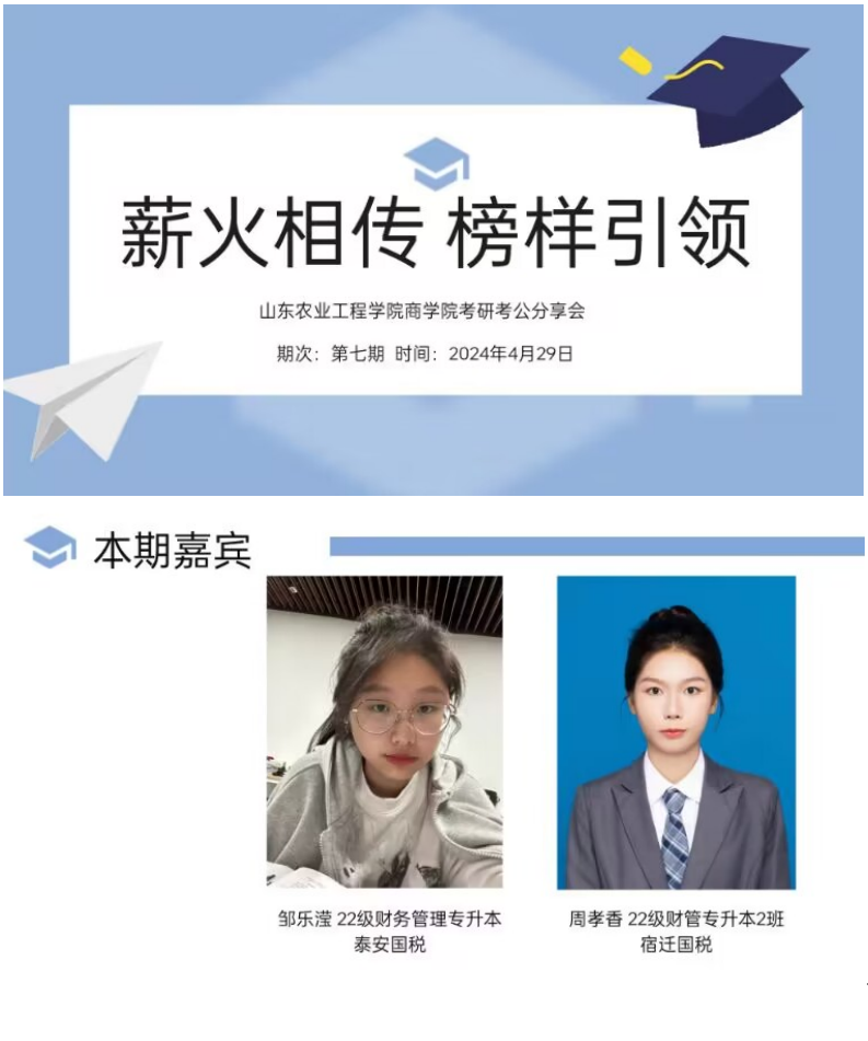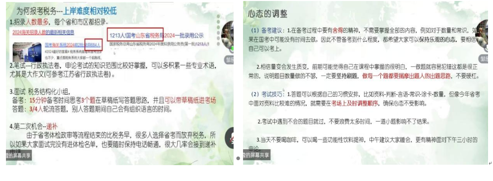 为提高同学们对考公的理解和认识,把握公务员报考的总体方向和趋势,提高考试复习效率,商学院于2024年4月29日举办了第七期“薪火相传,榜样引领”考公考研经验分享会。此次线上经验分享会聚焦公务员考试,特邀2022级财务管理专升本二班邹乐滢学姐和周孝香学姐为同学们分享她们的宝贵经验。