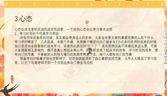 王良龙一学长主要从备考心得、时间规划、复习方法和重要节点及应试技巧四个方面深入浅出的进行了详细的介绍。首先他提出三个问题,即“是否考研?如何择校?什么时候开始准备考研?”帮助同学们确定考研目标。其次,在推荐相关课程的同时,他提出葫芦丝背书法,帮助学弟学妹们在考研期间加强记忆。最后,他鼓励同学们停止精神内耗,望远山而前行。