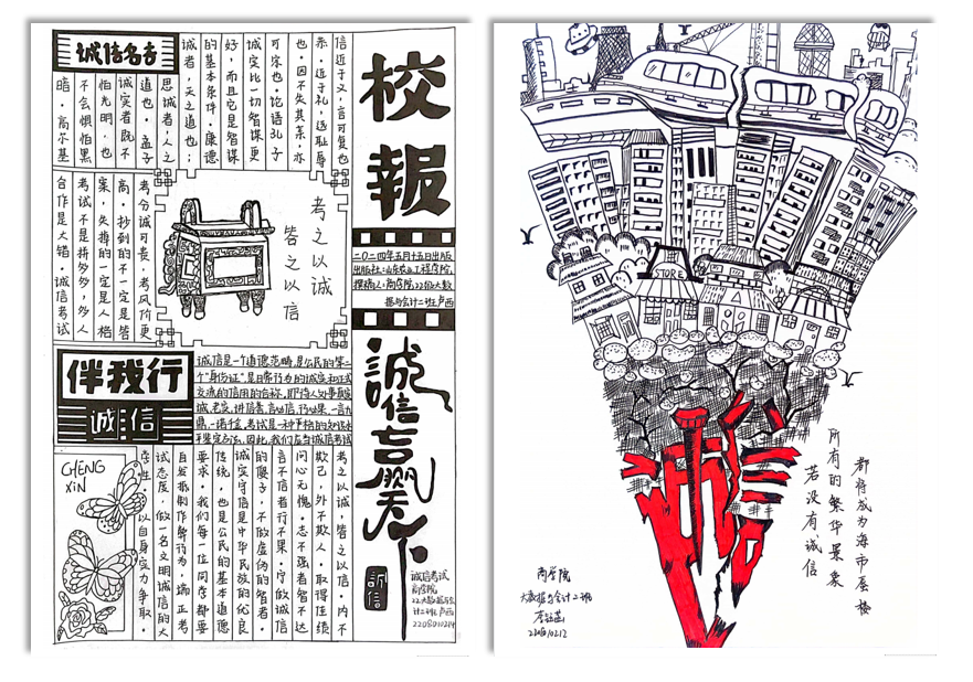 为深入贯彻立德树人的教育理念,提升资助育人工作的实效性,并进一步强化大学生的诚信观念,我院精心策划并举办了商学院“考之以诚,答之以信”书画比赛。本次大赛以弘扬爱国主义教育为核心,以资助诚信教育为目标,旨在引导学生们坚守诚信为本的原则,将诚信作为立身处世的基石。