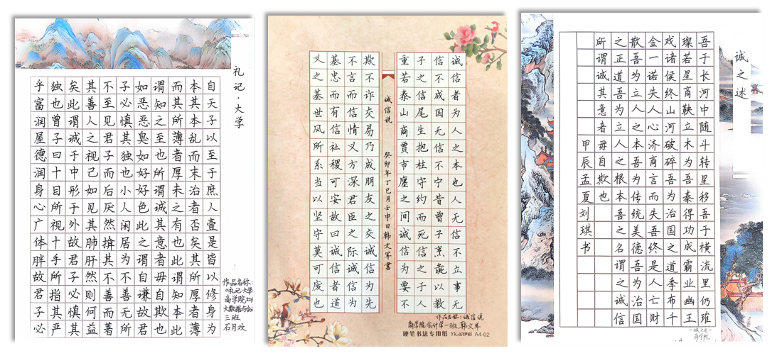 “考之以诚,答之以信”书画比赛的成功举办,不仅为商学院的学生们提供了一个展示才华、交流学习的平台,更在学院内掀起了一股诚信教育的热潮。不仅能够增进学生们对书画艺术的了解和传承意识,更能够在学院内营造一种爱国爱党、明礼诚信的浓厚氛围。相信在未来的日子里,商学院将继续秉承立德树人的教育理念,加强资助诚信教育工作,为培养更多具有高尚品德和卓越才能的优秀人才而不懈努力。