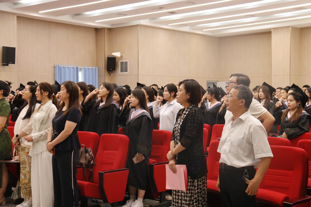 毕业宣誓环节,全体毕业生在优秀学生代表徐雅丽的带领下,集体宣读毕业誓词。“明德弘商,志存高远;追求卓越,敢为人先;守信重诺,尚中贵和;遵规守纪,廉洁自律;勇毅前行,踔厉分发;以梦为马,不负韶华!”铿锵有力的誓言,是青春的誓言,更是奋斗是誓言,充满了对未来的信心和对母校的感恩。