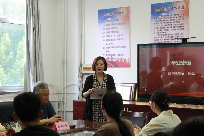 最后,院长连华向大家表示热烈祝贺和衷心祝福,并与同学们分享了优秀毕业生的经历,勉励各位同学:一是“穷则独善其身,达则兼济天下”,坚持饮水思源的家国情怀,努力成长为堪当民族复兴众人的时代新人;二是“竹杖芒鞋轻胜马,一蓑烟雨任平生”,积极向上,以阳光的心态拥抱生活;三是“长风破浪会有时,直挂云帆济沧海”,希望同学们能够在逆境中乘风破浪。她表示,学院是同学们永远的家,希望同学们毕业后和学院保持联系。
