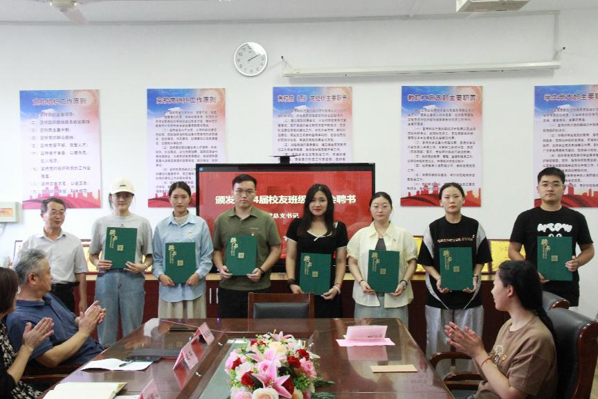 首先,举行校友理事会聘任仪式,商学院党总支书记刘相礼宣读通知并向李俊等十几位同学颁发理事聘书。随后,毕业生代表路薪钰带领大家进行宣誓。