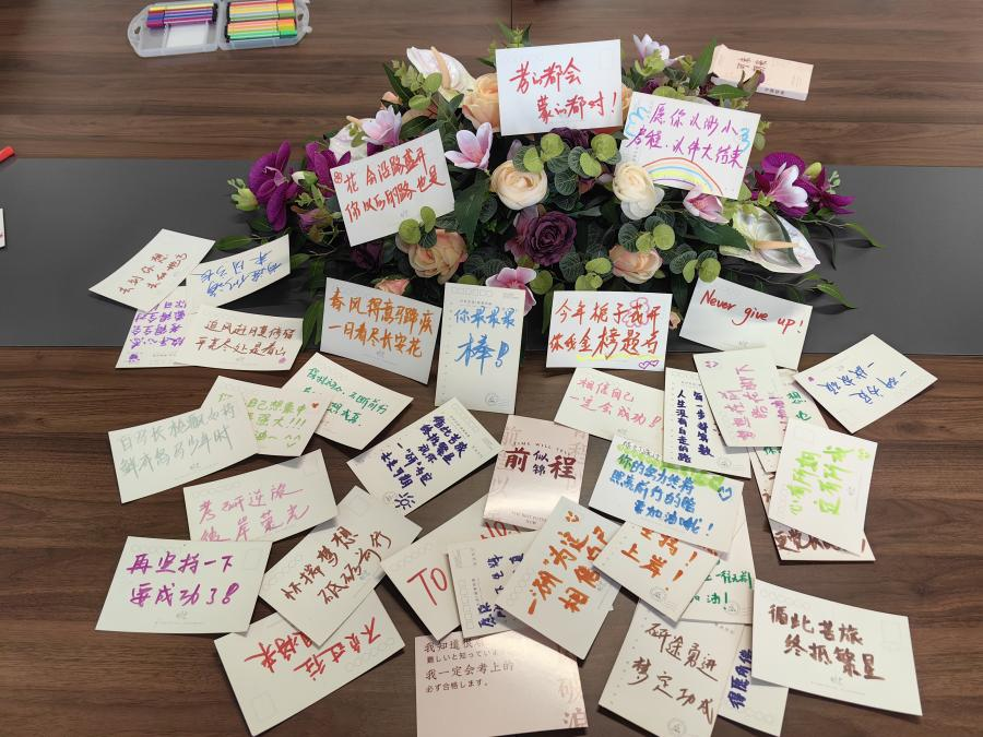 活动中,老师们亲手制作明信片的方式,为即将踏上考研征程的同学们送上了满载深情厚意的激励话语和真挚祝福。一句句诸如“岁月不负少年志,旗开得胜终有时”“以梦为马,不负韶华”“心怀梦想,脚踏实地”“心有所期,定有所成”的祝福语,不仅传递了老师们的美好祝愿,更寄托了对考研学子未来的殷切期盼。