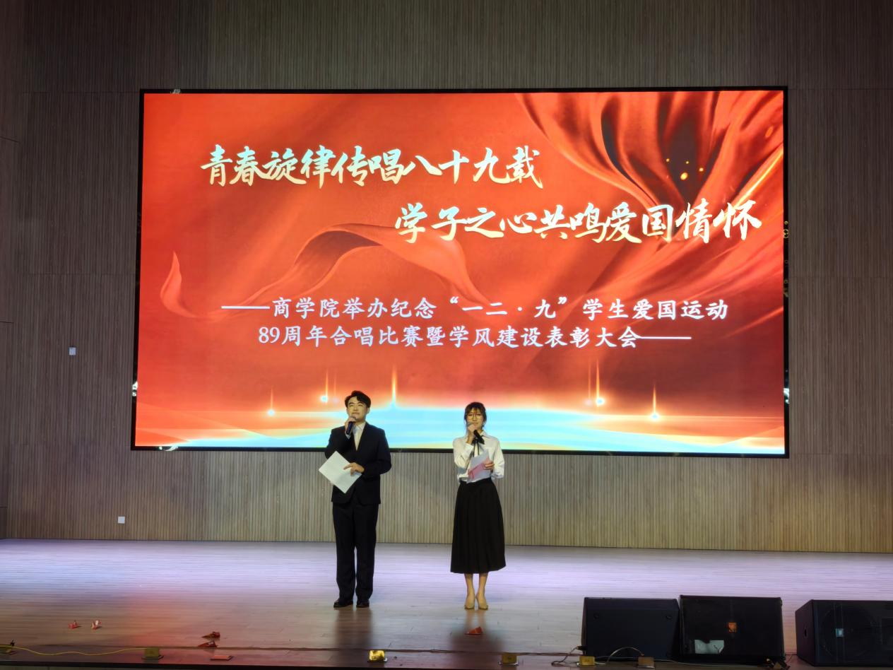 自筹备纪念“一二•九”学生爱国运动89周年合唱比赛以来,已经历时一个月。在这期间,各项准备工作在商学院统一组织和领导下扎实推进,商学院团总支辅导员王浸皓、姬雅婷等为同学们的合唱排练工作提供悉心指导。各班级的班委和同学们从选曲到利用课余时间刻苦排练合唱,从发声练习到情感表达,从节奏把握到队列配合,一遍又一遍地打磨,只为在合唱比赛中完美呈现经典爱国歌曲。全体工作人员满怀热忱,以务实的态度、严谨的作风、专注的精神,致力于打造一场意义深远、庄重热烈的纪念活动,让“一二·九”精神在新时代青年心中深深扎根、传承不息。