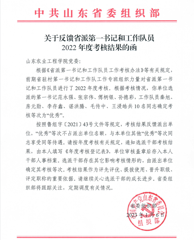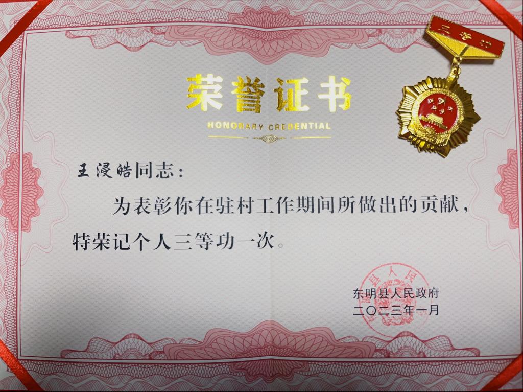 2023年1月16日,学校党委宣布了山东省委组织部关于反馈省派第一书记和工作队员2022年度考核结果的函,我院王浸皓同志考核等次为“优秀”;同时被东明县人民政府荣记个人“三等功”一次。