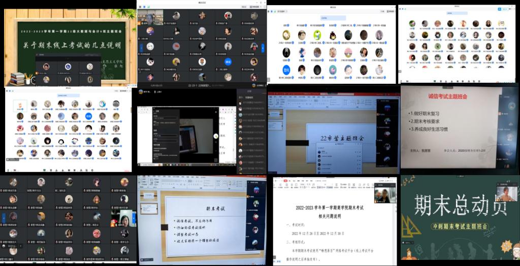 根据疫情防控形势,本学期期末考试采用线上考试方式进行。为加强学生诚信意识,严肃考风考纪,进一步巩固学风建设成果,商学院根据学校总体安排,下发《2022-2023学年第一学期商学院期末考试相关问题说明》,29位班主任分别于12月24-25日通过线上会议的方式召开考前动员大会和诚信教育主题班会。