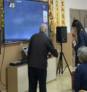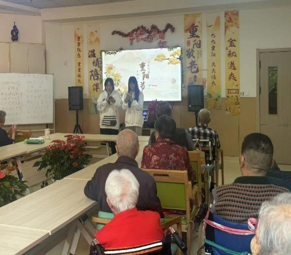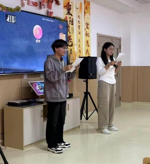 活动当天,商学院志愿者们以饱满的热情和精心的准备,为养老院的长者们献上了一场动人的歌唱表演。他们用歌声向祖国致敬,以旋律庆祝重阳佳节,展现了秋日里浓浓的温情与敬意。养老院的老人们也积极参与其中,争相登台,用他们的歌声和热情回馈着这份关爱。每一首歌曲都触动着在场每一个人的心灵,每一次掌声都是对生命价值的深情肯定。