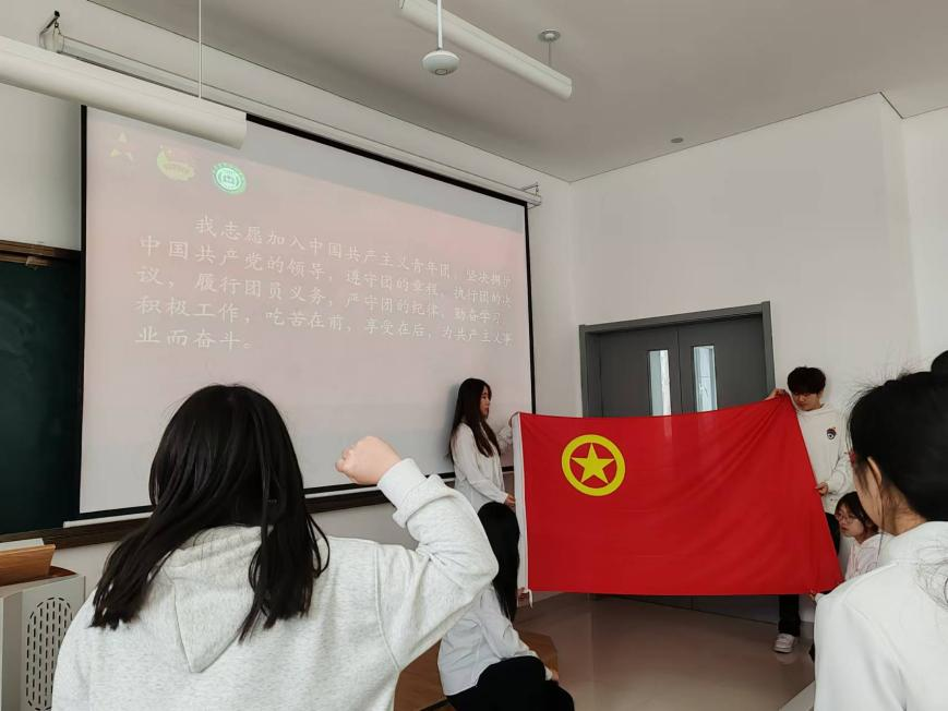 在团旗下宣誓环节,全体新团员起立,举起右手,握拳过肩。团员代表蒋雨祺带领新团员庄重宣誓,誓言铮铮,响彻室内,展现出青年团员的蓬勃朝气与坚定决心。宣誓完毕,新团员们有序落座。