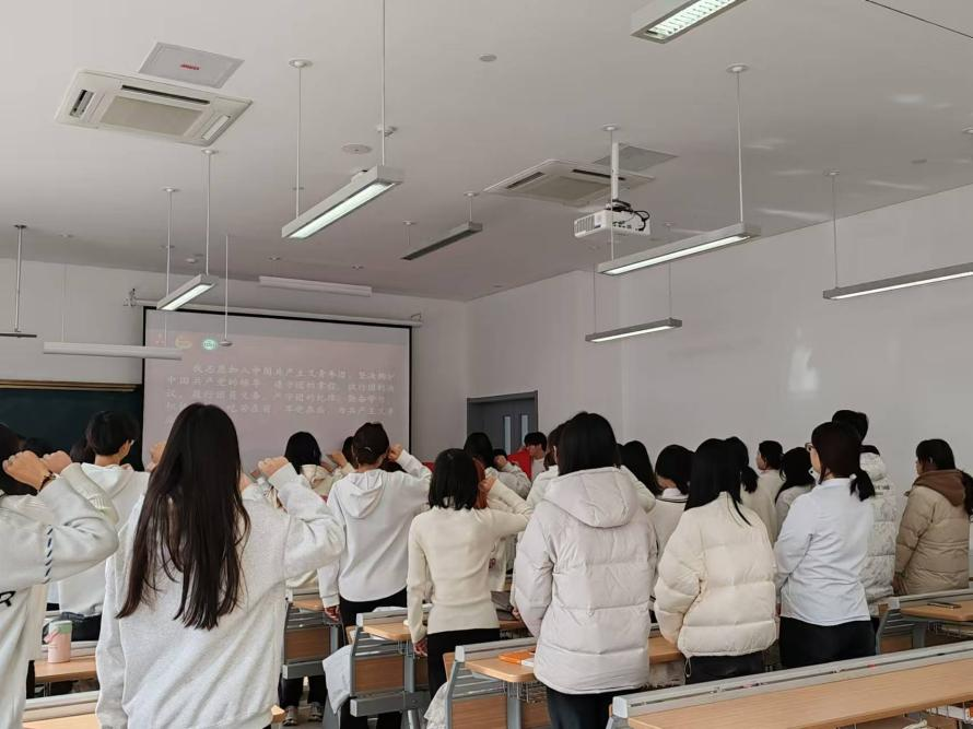 本次入团仪式由23级财务管理专业的孙玮主持。仪式在庄严的国歌声中拉开帷幕,全体起立,奏唱国歌,激昂的旋律回荡在教室,点燃了在场每一个人的爱国热情。大家目光专注,歌声洪亮,向祖国表达敬意,营造出庄重氛围。