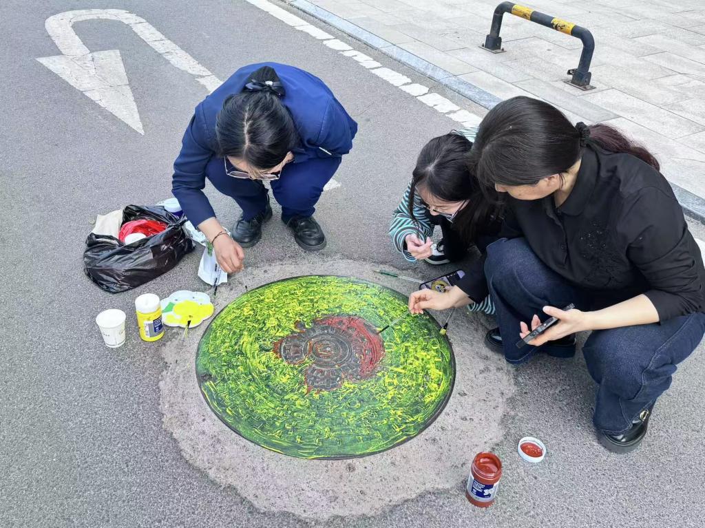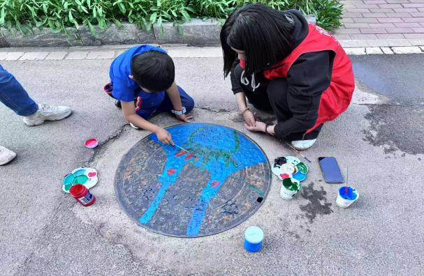 绘画过程中,孩子们热情高涨,充分展现出丰富的想象力。有的孩子以“垃圾分类”为主题,绘制出卡通垃圾桶与可回收物品的互动场景;有的围绕“交通工具”,将飞机、船舶等绘于“盖”上;还有的以“文明城市”为灵感,描绘出市民友好互助、共建美好家园的温馨画面。五颜六色的画笔在孩子们手中飞舞,原本灰扑扑的井盖逐渐被赋予生命,变成一幅幅充满童趣的艺术作品。