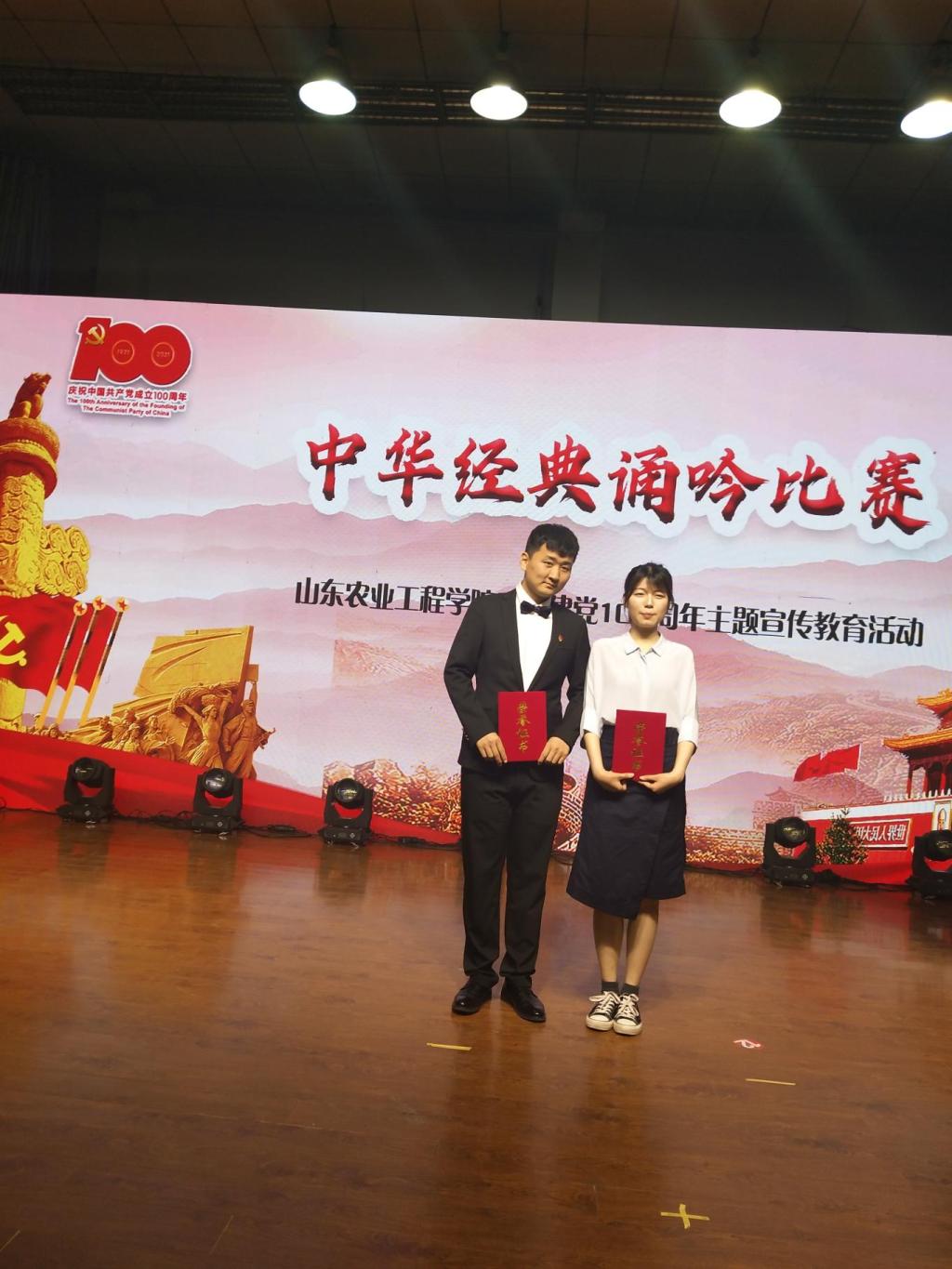 4月22日下午,由学校工会组织举办的“中华经典诵吟比赛”在济南校区大礼堂举行。商学院单艺老师以诗词《沁园春.长沙》和《沁园春.雪》荣获经典吟诵比赛佳奖。