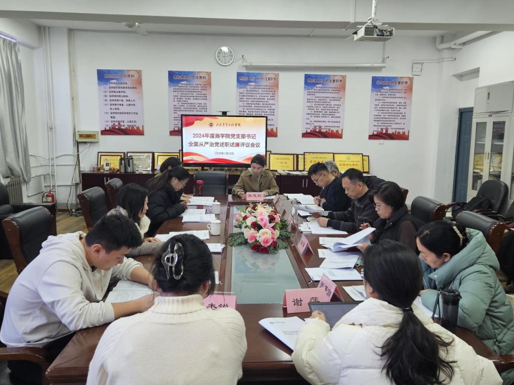 1月20日下午,商学院召开2024年度党支部书记全面从严治党述责述廉评议会议。学院党总支委员、各支部书记、办公室主任、各支部代表参加会议。会议由商学院党总支书记李欣主持。