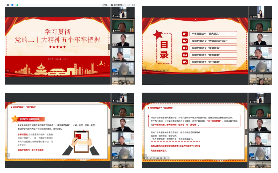 崔师睿老师以“学习贯彻党的二十大精神五个牢牢把握”为标题讲解党的二十大精神。“五个牢牢把握”为学习贯彻党的二十大精神提供根本遵循,既“继往”又“开来”,既有“怎么看”的认识论又有“怎么办”的方法论,既有“如何实现”的基本路径又有“何以成功”的根本保证,精准概括了党的二十大精神的重点和精髓,科学回答了学习贯彻党的二十大精神必须弄明白的五个问题。