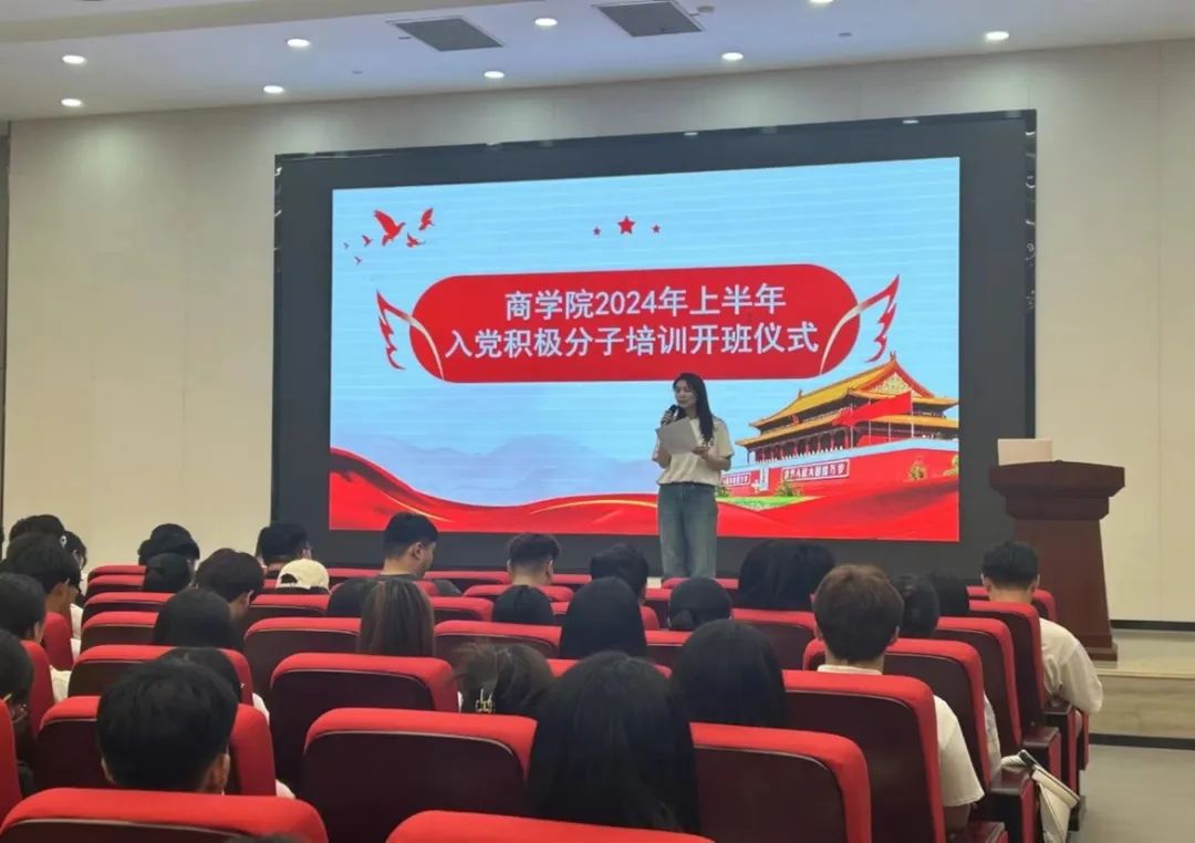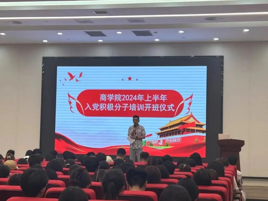 为深入理解党的历史、宗旨和奋斗目标,学习党章党规和习近平总书记中央系列讲话精神,培养入党积极分子,开展入党培训工作,商学院2024上半年入党积极分子培训开班仪式于5月28日在文法西楼报告厅隆重举行。出席开班仪式的有商学院党总支副书记王世辉老师、团总支书记党春蕾老师、辅导员张鑫洪老师、蒋杰锐老师、张慧茹老师,学生党员以及全体入党积极分子。