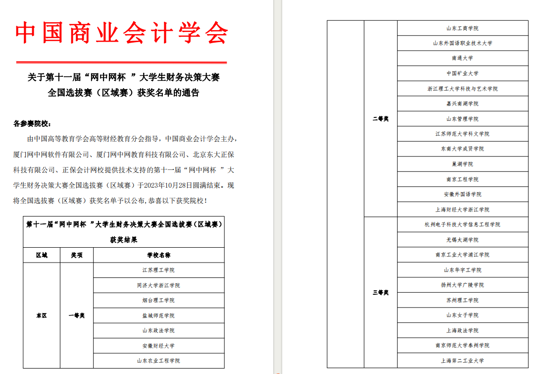 第十一届“网中网杯”财务决策大赛全国选拔赛(区域赛)10月28日落下帷幕,本次大赛由中国高等教育学会高等财经教育分会指导,中国商业会计学会主办,全国高校共200多支代表队同场竞技,我院仲冠杭、王馨婕、王博、李乐乐四位同学进行了为期一个多月的团队协作综合实训,凭借出色的发挥获得东区大学生财务决策大赛一等奖。