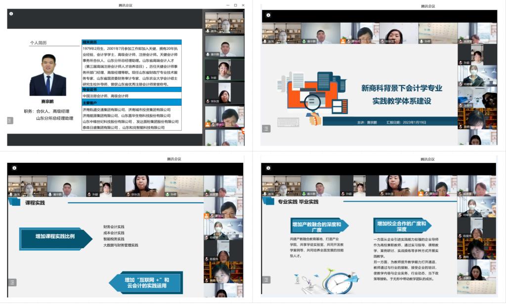 2023年1月19日,会计教研室开展“新商科背景下实践教学体系建设”线上研讨会。天健会计师事务所合伙人、注册会计师、山东省高端会计人才赛宗鹏结合与学校合作经验进行新商科背景下实践教学体系建设的专题讲座,会计教研室全体成员参加此次研讨会。