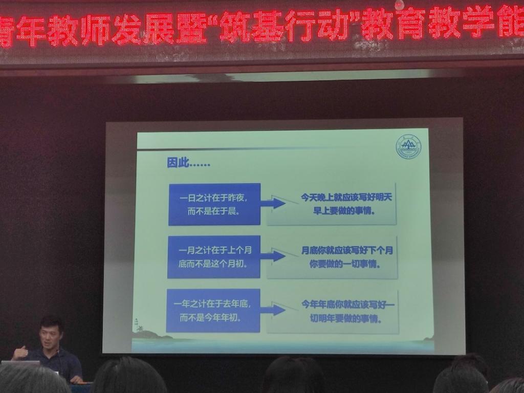 时间如白驹过隙,为期6天的青年教师发展暨“筑基行动”教育教学能力提升培训活动也进入尾声,但老师们仍然热情饱满、积极且认真。8月15日上午,山东大学管理学院的班博副教授以《青年教师成长中的时间与目标管理》为主题进行了专题讲座。班博副教授首先以真实案例为切入点,强调了教师是一份神圣的职业,教师应当将“十年树木,百年树人”铭记于心,真正做到学高为师、身正为范。
