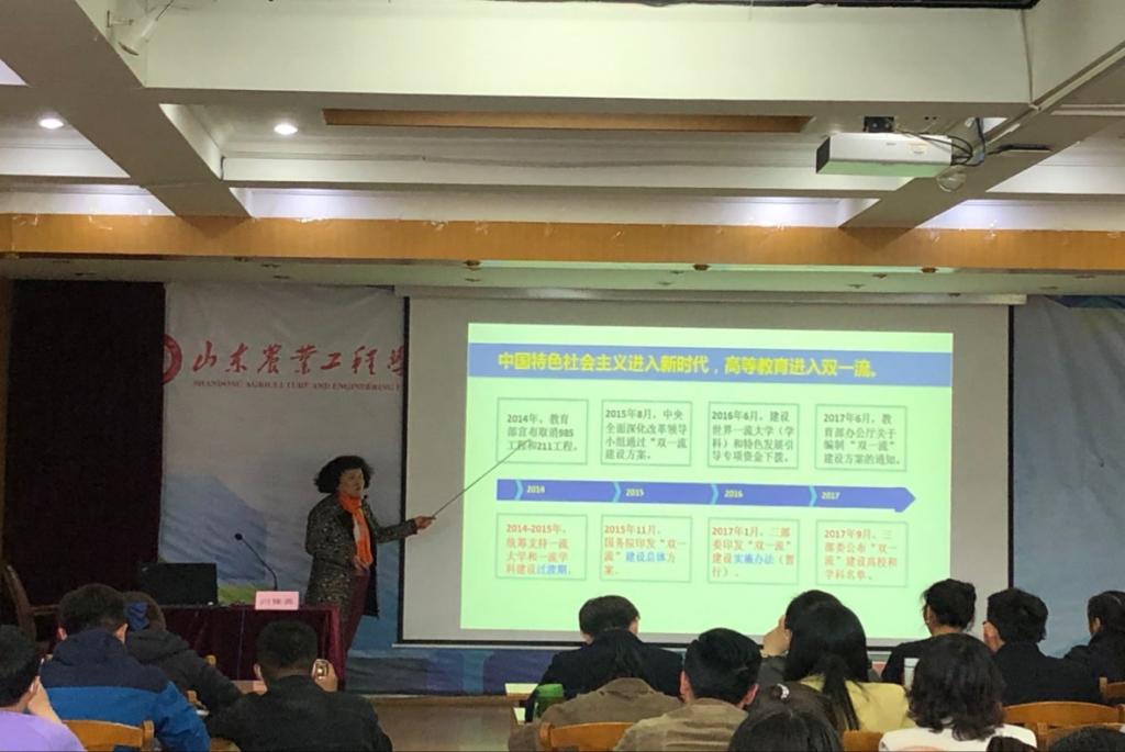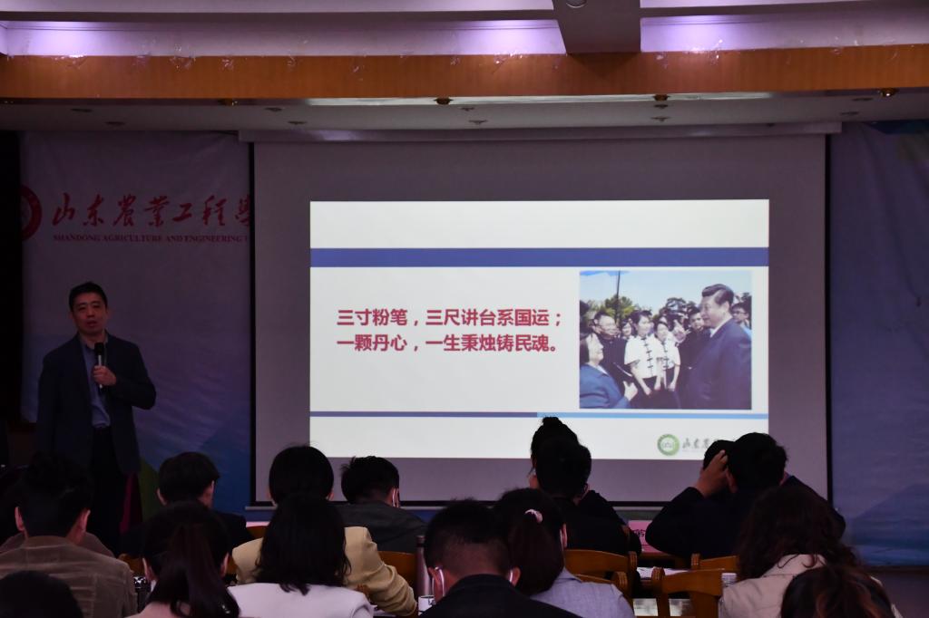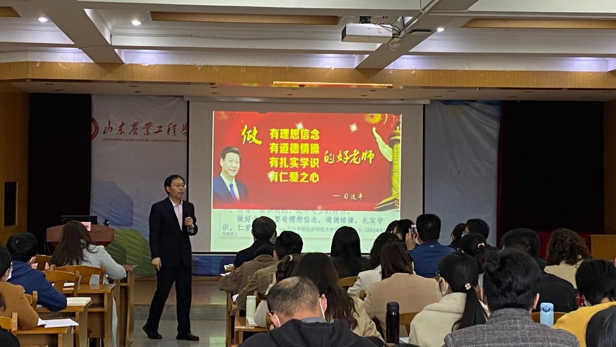 为帮助新入职教师特别时青年教师更好的适应课堂教学。今年会省级教学名师、师德标兵闫保英教授为广大教师作《如何成为一名合格的人民教师》的教学示范报告。闫保英结合三十多年的教学经验,阐述了合格教师的标准,精彩而深刻示范了如何上好一节课、怎样上好一堂课、怎样育好学生的课堂建设经验。