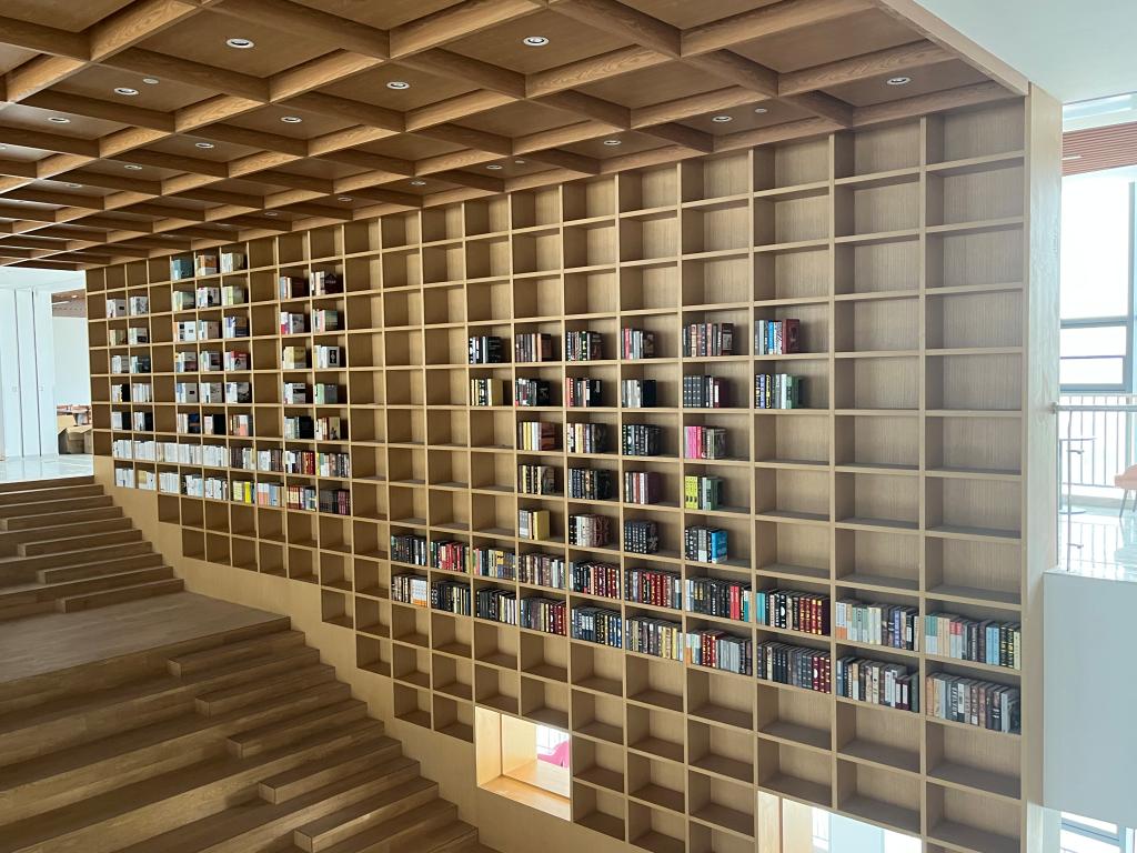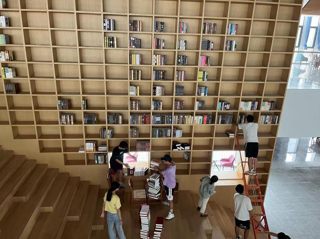 机电学院的杨绪奇、徐国程、张兆峰,食品学院的李传里、王颖、杨元庆、高天宇,国测学院的王腾、付凯歌等11名同学,在图书馆老师带领下,克服天气炎热、登高摆设等困难,经过一天辛勤付出,将1000多册图书填充放置于“博雅知阶”文化墙内,完美展示了图书馆“山工”标志的文化名片。