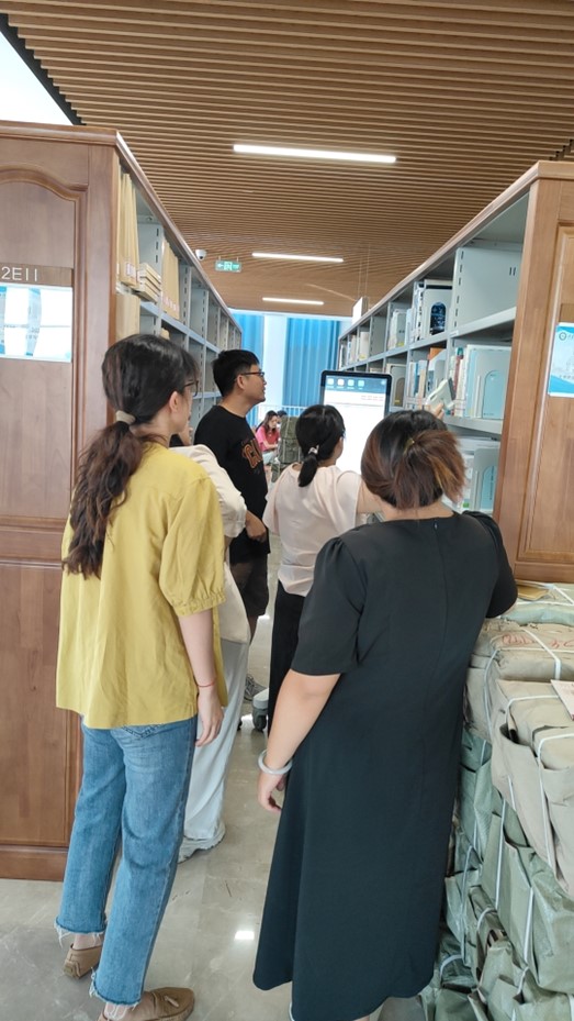 吕通向馆员详细介绍了盘点机盘点、顺架、上架、强制定位、首书定位与检测、剔旧等功能的原理、操作步骤以及常见问题的处理方法,并带领馆员前往二楼南区书架现场讲解顺架工作的基本操作步骤。参加培训的馆员认真听取培训讲解,轮流进行操作练习,并就一些日常操作进行了深入交流。