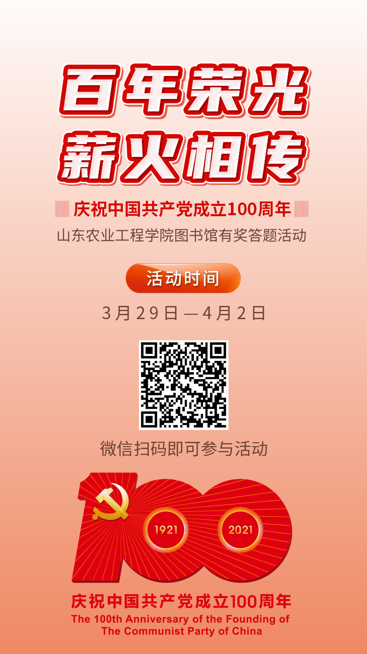 2021年是中国共产党成立100周年,也是“十四五”开局之年和“两个一百年”历史交汇的关键节点。为深入学习贯彻习近平总书记在党史学习教育动员大会上的重要讲话精神,在中国共产党百年诞辰来临之际,博看网联合全国图书馆举办“百年荣光 薪火相传”有奖知识竞答,引导广大读者学史明理、学史增信、学史崇德、学史力行,学党史、悟思想、办实事、开新局,以昂扬姿态奋力开启全面建设社会主义现代化国家新征程,以优异成绩迎接建党一百周年。