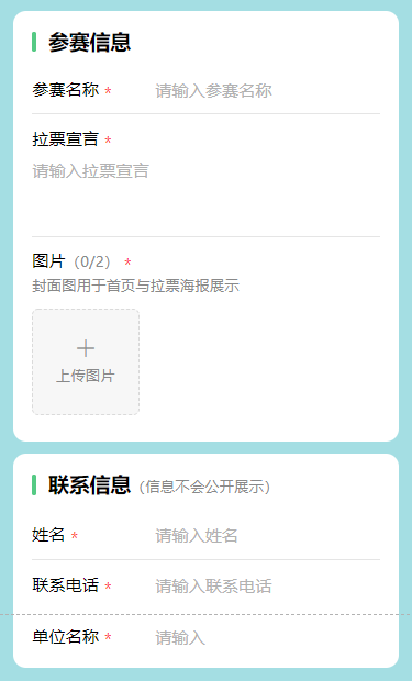 在参赛作品页面输入作品名称、作品说明(“拉票宣言”)、上传作品,并准确填写个人联系信息提交后等待审核: