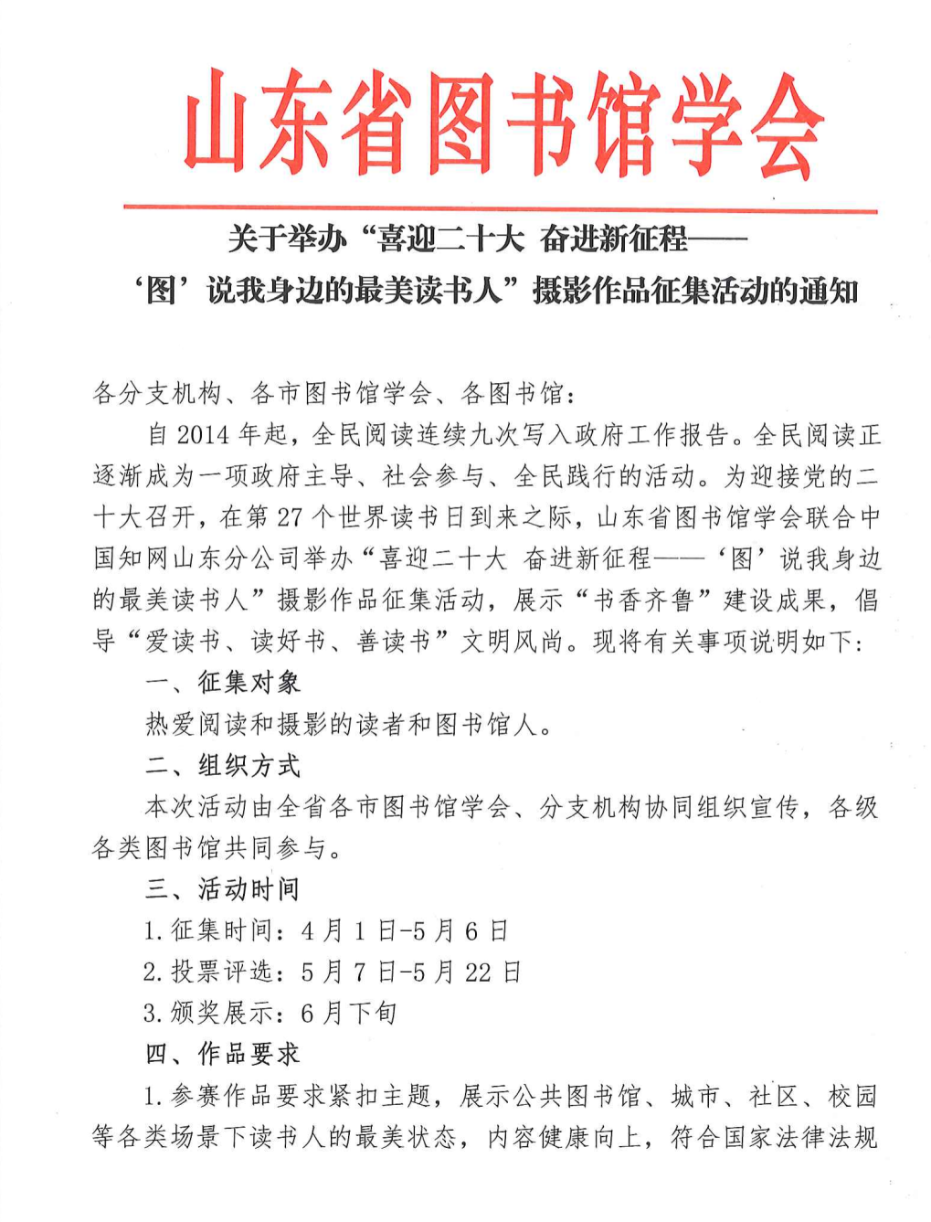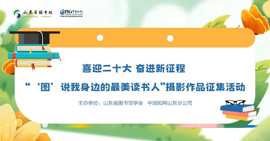 在第27个读书日来临之际,山东省图书馆学会将与中国知网山东分公司合作举办“喜迎二十大 奋进新征程——‘图’说我身边的最美读书人”摄影作品征集活动,让我们用镜头定格下眼中“最美读书人”的身影,一起分享画面背后的故事。