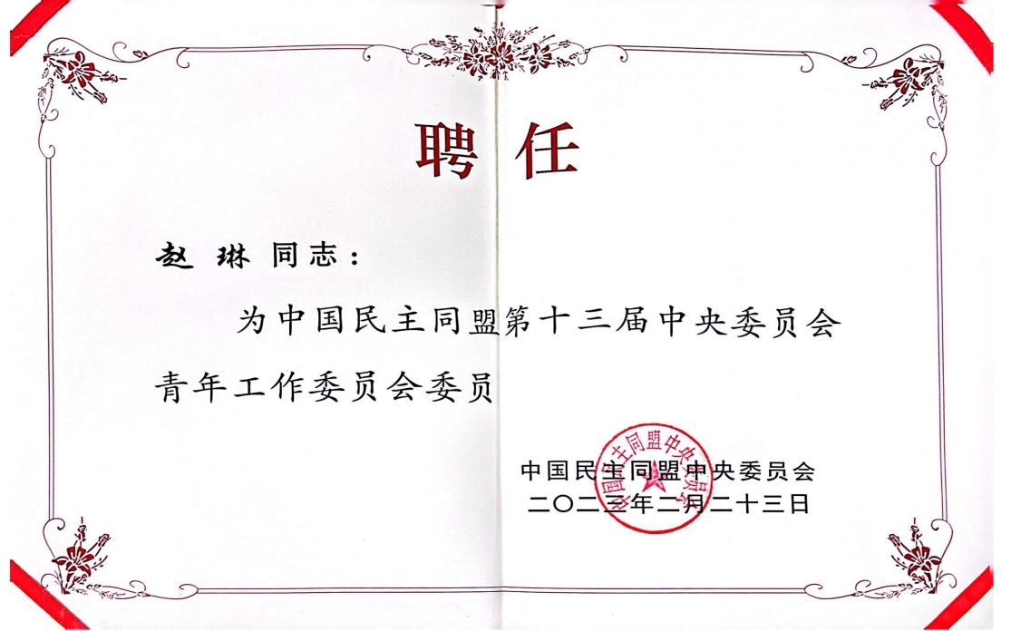 近期,今年会民盟支部主委赵琳同志当选为中国民主同盟会中央委员会第十三届青年工作委员会委员。