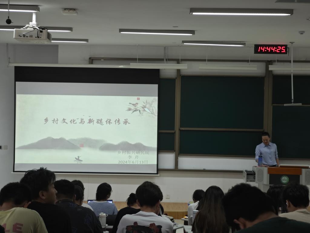 报告主要分为三个部分,首先是乡村文化的重要组成,其次是新媒体的现状,最后是把握“流量”时代,借力新媒体的迅速发展,进行乡村文化的推广与传播、传承。此次报告中,学生充分参与讨论,形成较好的氛围。