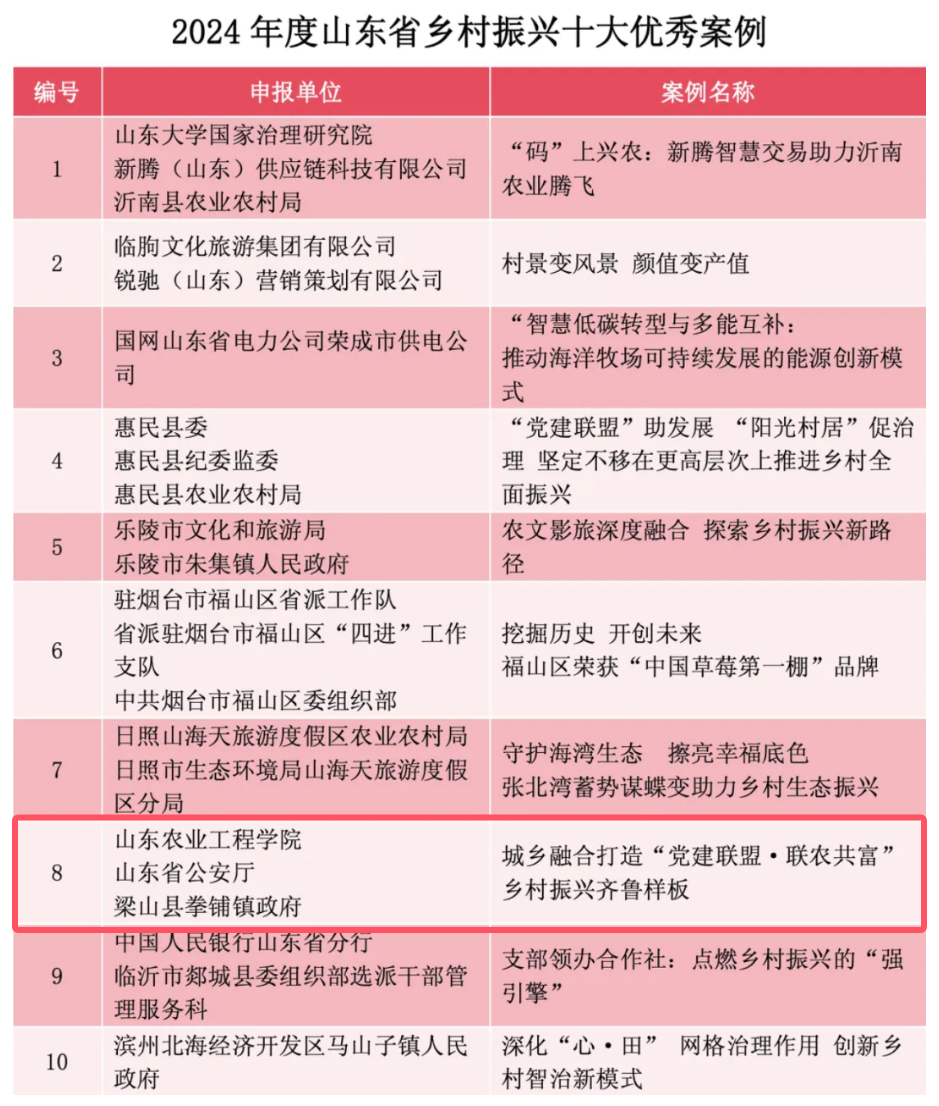 近日,由山东省农业农村厅(山东省乡村振兴局)、山东社会科学院指导,山东省乡村振兴研究会主办,山东大学经济学院、山东社会科学院农村发展研究所、山东广播电视台农科频道承办的2024年度山东省“乡村振兴优秀案例”评选活动公布了获奖结果。今年会乡村振兴研究院联合山东省公安厅、梁山县拳铺镇政府共同申报的《城乡融合打造“党建联盟·联农共富”乡村振兴齐鲁样板》案例,以突出的实践成果、创新的工作模式和可推广的经验,从800余个申报案例中脱颖而出,荣获2024年度山东省“乡村振兴十大优秀案例”之一。