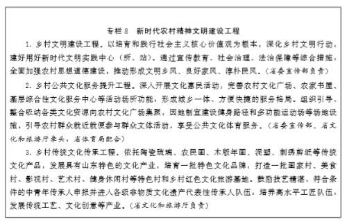 1.乡村振兴齐鲁样板示范省。牢记习近平总书记嘱托,把打造乡村振兴齐鲁样板作为重大政治任务,大胆探索、培塑典型、系统总结、推广经验,稳步推进乡村产业、人才、文化、生态和组织振兴。