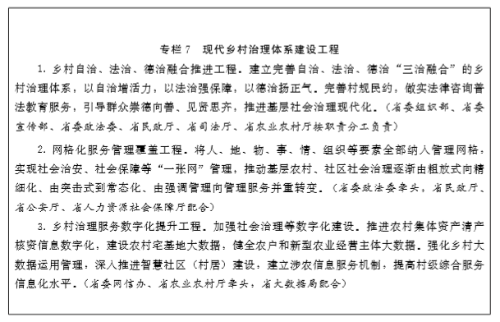3.提升乡村法治水平。编制实施“八五”普法规划,开展“法律进乡村(社区)”活动,广泛宣传与农民群众生产生活密切相关的法律法规。实施农村“法治带头人”培育工程,加强民主法治示范村(社区)建设,实现每个村(社区)有一处法治文化阵地。健全农村公共法律服务体系,抓好“村(居)法律顾问”工作,推进村(社区)司法行政工作室建设。建立健全农村地区扫黑除恶常态化机制,依法加大对农村邪教活动打击力度。深化农村社会治安防控体系建设,强化网格化管理,提升农村治安防范治理水平。(省委政法委牵头,省司法厅、省公安厅配合)