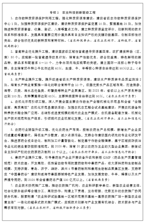 1.加快推进现代种业发展。大力开展种业自主创新,实施农业良种工程和现代种业提升工程,以培育突破性高质高效农业新品种为核心,整体设计种质创新、技术创新、品种培育和高效繁育等全创新链条,建立产学研融合、育繁推一体的现代种业科技创新体系,打造省级商业化农业生物育种平台,加快现代种业强省建设。到2025年,培育具有重大应用前景和自主知识产权的突破性优良品种100个,壮大一批研发创新力强、市场竞争力强的“育繁推”一体化种业企业。到2025年,综合经营实力进入全国前50强的种业企业达到10家。推进国家区域性畜禽基因库、国家区域性良种繁育基地、北方种子交易中心、省级农作物种质资源库、济南植物基因编辑基地、烟台中国北方种谷、青岛国家海洋渔业生物种质资源库等建设。(省科技厅、省农业农村厅、省畜牧局牵头,省农科院、省发展改革委配合)
