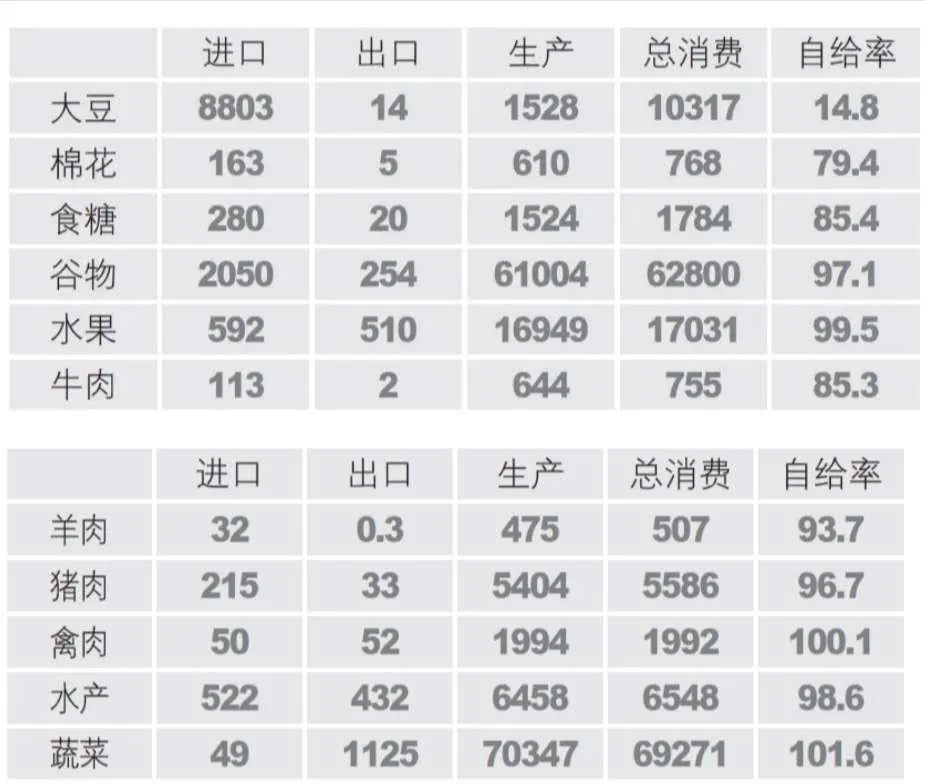 表 2018 年我国主要农产品自给率(万吨,%)