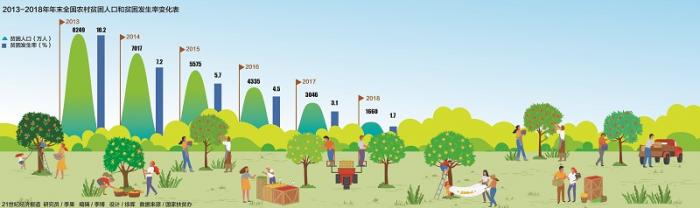 2013-2018年,我国农村贫困人口从9899万减少到1660万,每年减贫人数都保持在1200万以上,832个贫困县已脱贫摘帽436个。预计到今年底,全国95%左右现行标准下的贫困人口将实现脱贫,90%以上的贫困县将实现摘帽。