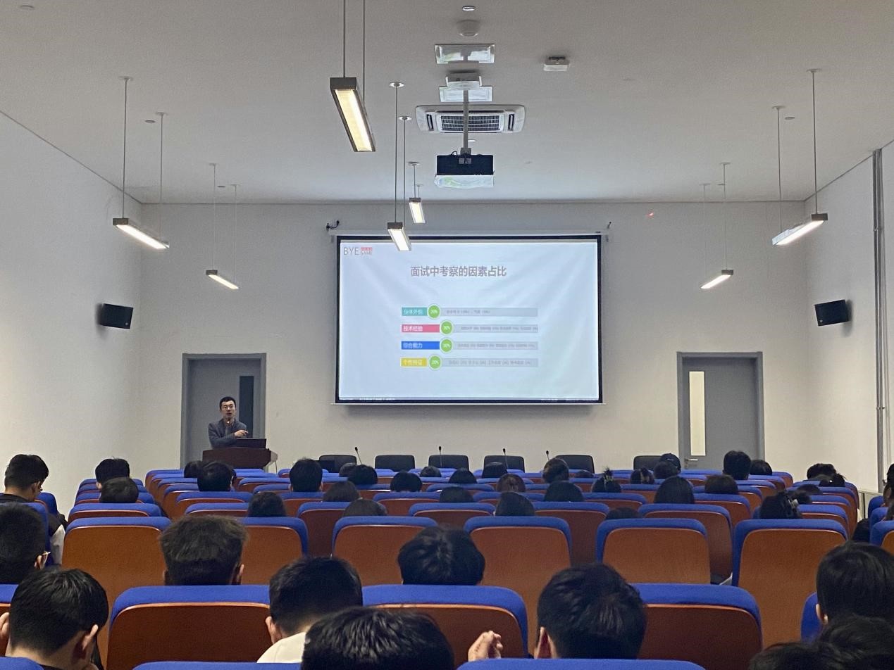 之后,赵成老师对面试问题进行解读。其一是面试考察的因素占比,身体外貌占百分之二十、技术经验占百分之三十、综合能力占百分之三十、个性特征占百分之二十。其二是五个HR常问的五个面试问题,并从中给出解析。第一个问题是自我介绍,考察求职者的语言表达能力以及逻辑思维能力。第二个问题是个人职业规划,考察求职者是否有转行的想法。第三个问题是关于加班的看法,考察求职者是否能在承受加班。第四个问题是关于就业城市,考察求职者的稳定性。第五个问题是对公司的了解,考察求职者对招聘公司本次面试的重视程度。在报告会的结尾,赵成老师介绍了百杉集团的就业情况以及公司发展情况。
