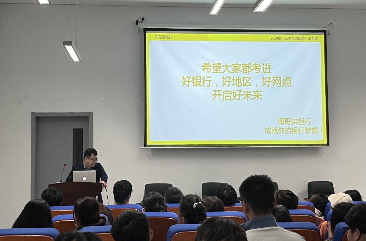 讲座开始,于海老师按照网上申报再到银行笔试最后进行面试的顺序概述银行招聘的内容,让同学们初步理解银行如何进行招聘。随后于海老师为同学们全面深入地介绍了国内银行招聘的基本情况和发展趋势,详细介绍了银行就业的优点,例如社会地位高、工作稳定、收入高、离家近等,并充分讲述了银行的薪资待遇、福利待遇、奖金等,又列举往年成功案例,为同学们考取银行增添动力。