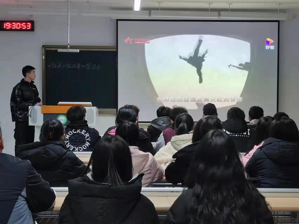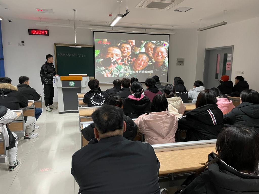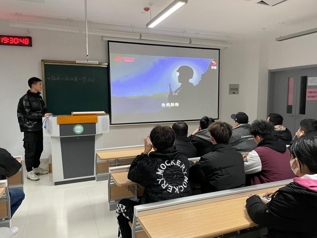 会中,通过观看征兵宣传的短视频,同学们心中的热血久久不能平复,意识到参军不论对国家的安危,还是对个人的成长,都是一条光明大路。接着苗逸瑄向大家简要科普征兵的相关内容,同时并讲述了当兵入伍的益处,不仅可以增强自身的意志、提高自己的身体素质,还可以享受到优先选拔使用、考研升学优惠等优惠政策。最后,苗逸瑄作为退伍军人表示希望大家踊跃参军,为国家建设贡献出自己的一份力量。