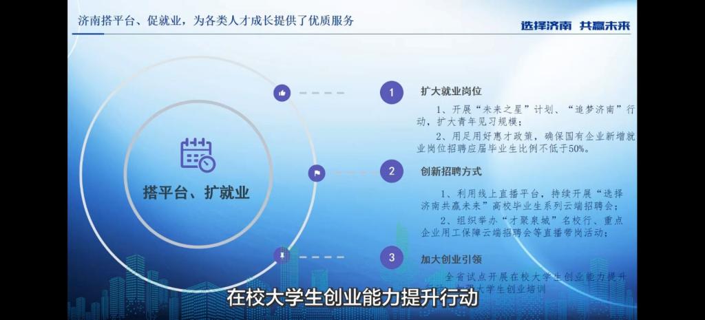 直播中专家提出:济南环境优、前景广,为各类人才成长提供了丰厚沃土;济南诚意满、政策足,为各类人才成长提供了强力支持,努力创建早签约、快就业、易创业的形势济南搭平台、促就业,克服疫情期间带来的负面影响,为各类人才成长提供优质服务。