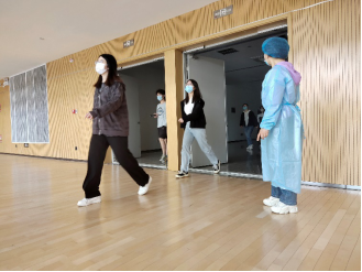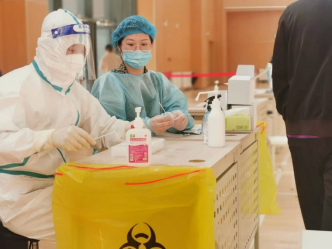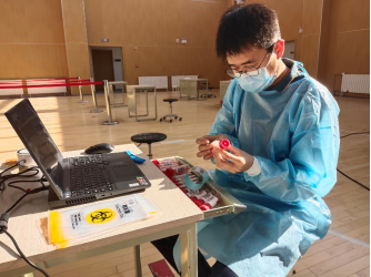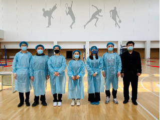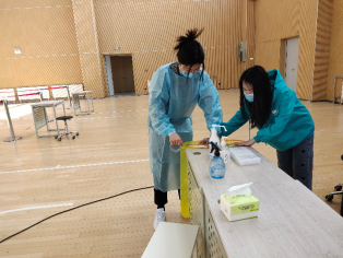 体育馆应核酸检测要求分设四个区域:等待区、分流区、打卡区、检测区。志愿服务主要包括以下三项:疏通管理应检队伍、打卡监督、协助医务人员。在副院长黄芳的带领下,我院老师分工明确,夏天宇老师负责等待区人员的管理与疏通,黄芳老师负责分流区人员的分流控制,孙召柱和张翔宇老师负责检测区的打卡监督,提供试管和样本袋的工作,赵丛楠和周丽美老师为医护人员提供医用棉签,以及将混采检验瓶(20人一组)封装进样本袋进行消毒,并放入样本收集桶。