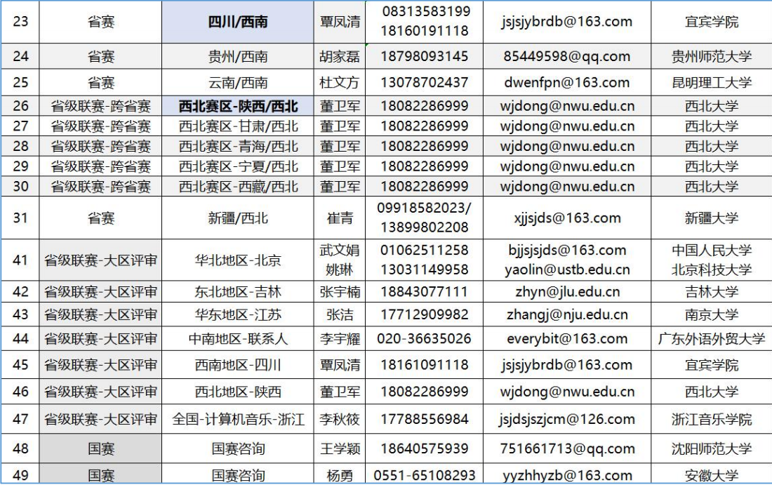 6.每校参加省级赛(包括省赛和省级联赛)作品的数量与评审规则,由各省级赛区组委会自行规定。省级赛的某个或某些企业赛题、计算机音乐创作类的参赛作品的评审,经协商也可由本省所在地区的省级联赛的大区负责点组委会进行评审。省级联赛的大区负责点原则上按6个大区设置,其中华北地区由北京市赛组委会负责(北京),东北地区由吉林省赛组委会负责(吉林),华东地区由江苏省赛组委会负责(南京),中南地区待定,西南地区(西藏除外)由四川省赛组委会负责(成都),西北地区与西藏由省级西北赛区组委会负责(西安);计算机音乐创作类参赛作品的省级联赛大区评审,还可由杭州决赛区的浙江音乐学院负责。