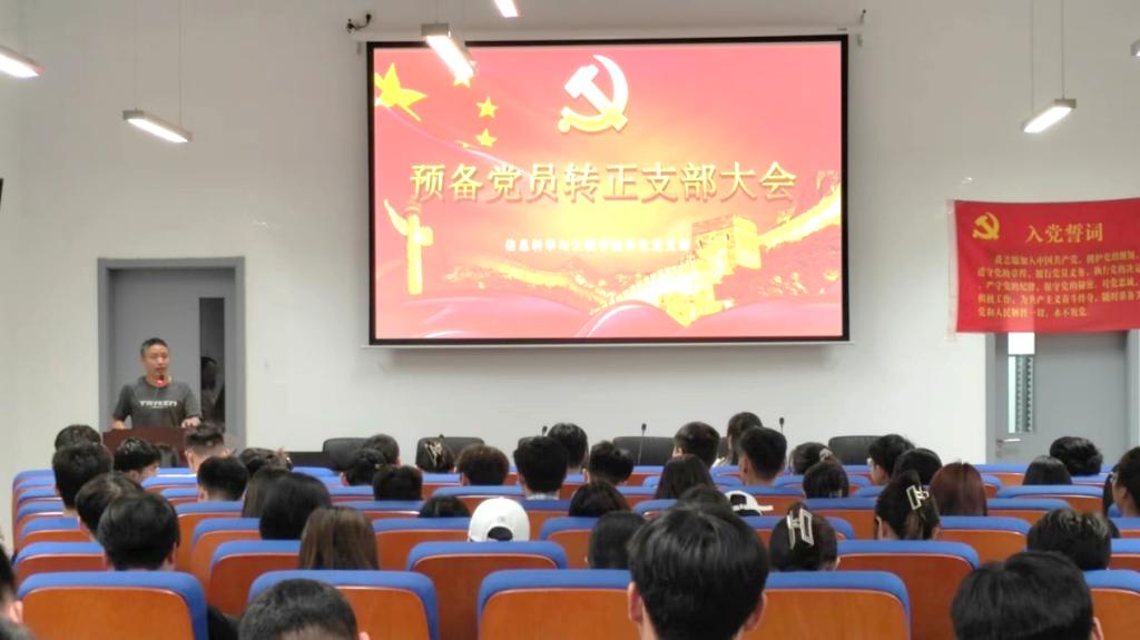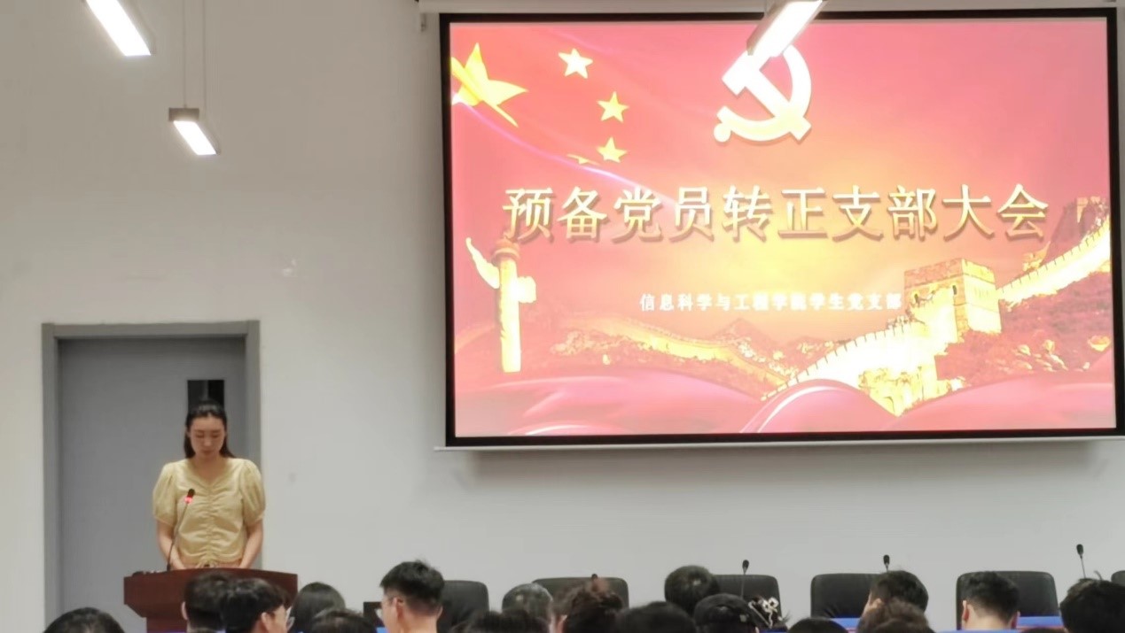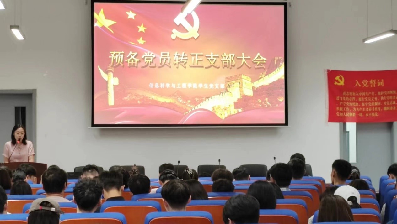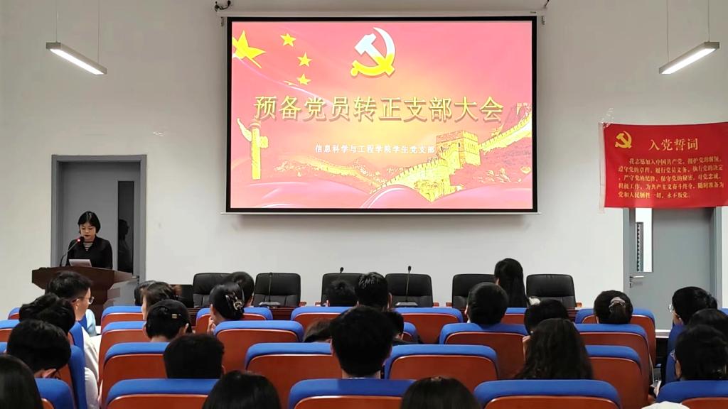 2023年6月9日12时,信息科学与工程学院于理工东楼A101召开预备党员转正支部大会。会议由信息科学与工程学院学生党支部书记刁丽娜主持,信息科学与工程学院党总支副书记孙向群,教师夏天宇、赵丛楠、赵晓芳、孙兆柱,以及支部全体党员、预备党员共同参加。