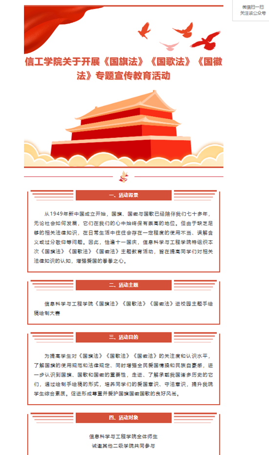 1.通过各班班长将活动通知转发至班级群内,积极鼓励班级内的同学依照活动通知要求开展《国旗法》《国歌法》《国徽法》专题宣传教育活动。同时通过学院官方微信公众号、学院官网等社交媒体平台,进行宣传推广,引导学生关注相关法律内容。