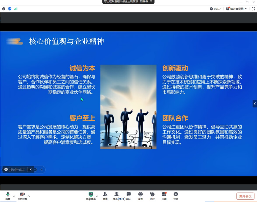 宣讲会采用线上直播的形式,通过先进的视频会议平台,实现了企业与学院师生的实时互动。会上,公司高层领导详细介绍了公司的发展历程、企业文化、业务范围以及未来发展规划。他们强调,公司始终秉承“创新、务实、高效、共赢”的企业精神,致力于为客户提供高品质、高效率的机械设备解决方案。